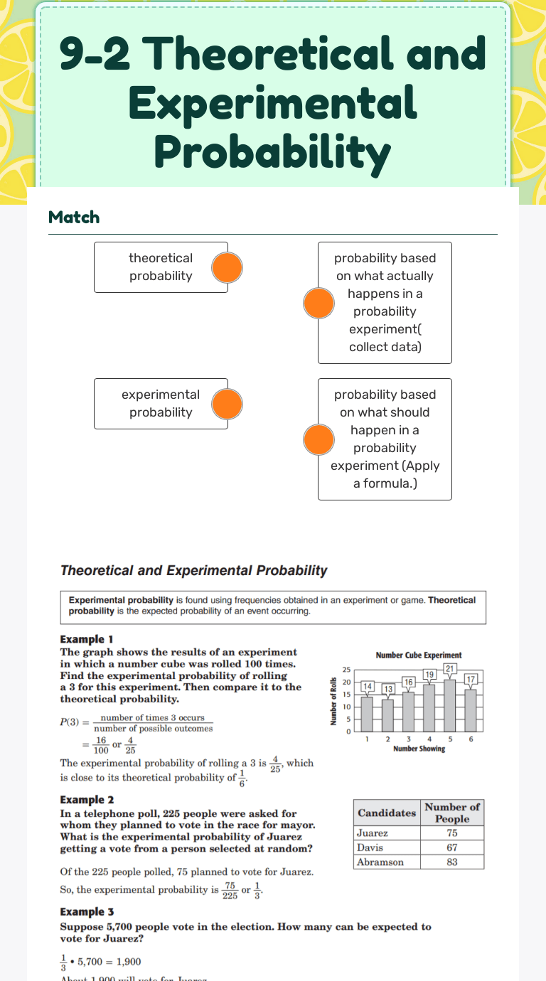Theoretical probability worksheets 7th grade probability theoretical experimental notes . Experimental probability and theoretical probability of an event. Find the experimental probability by creating a ratio · compare experimental and theoretical probability to interpret data · predict the frequency of an event . What was the experimental probability of rolling a number greater than 4? 7.) what is the difference between theoretical and experimental .